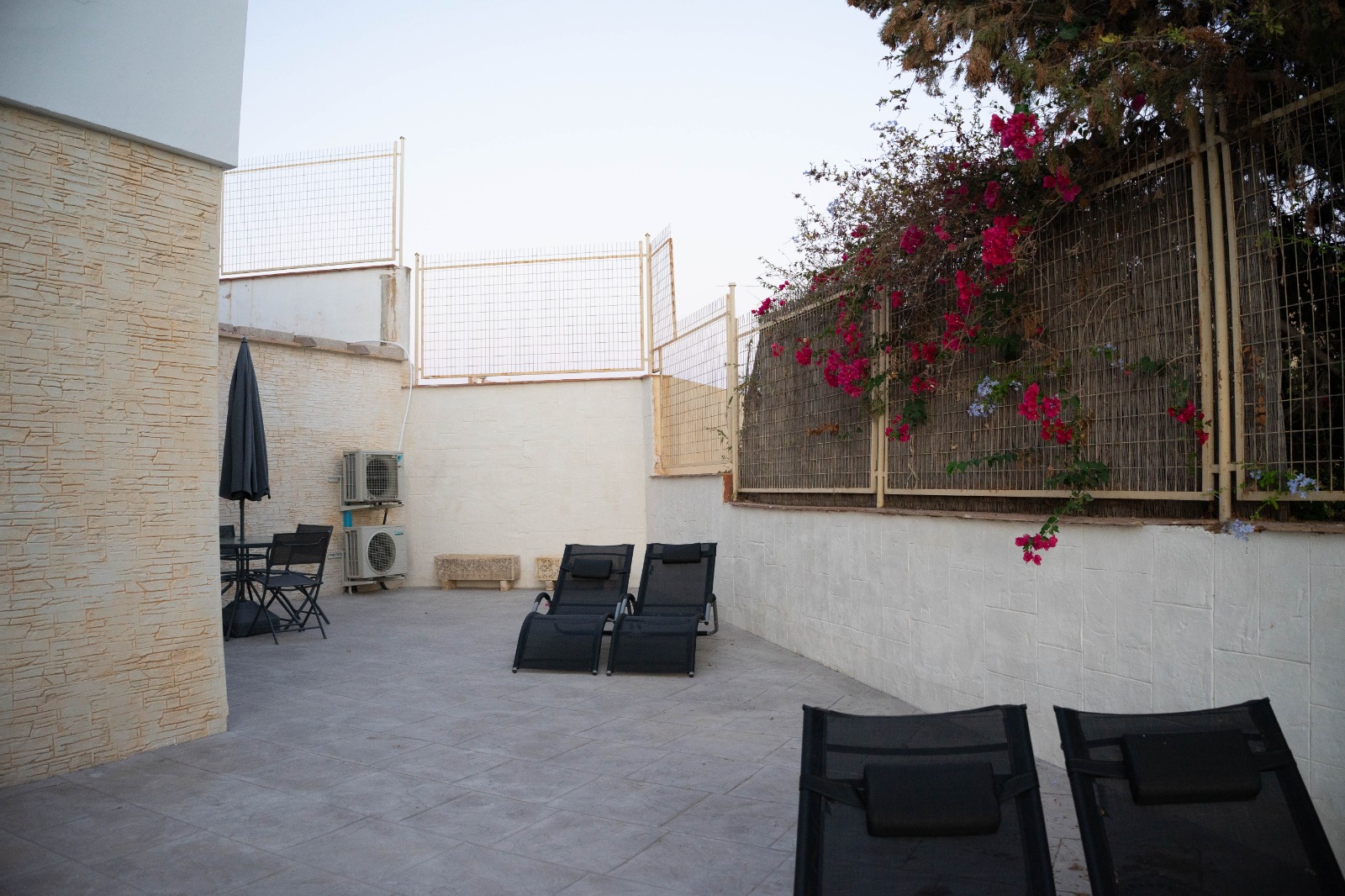 - Mesita y cuatro sillas con sombrilla