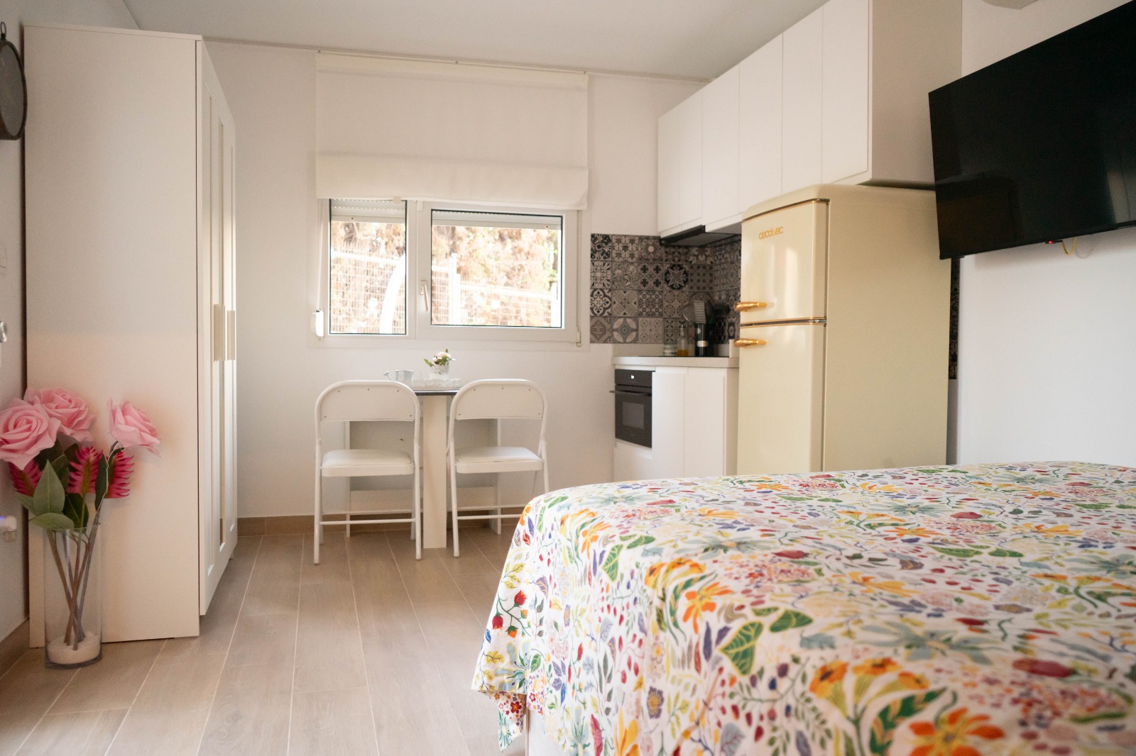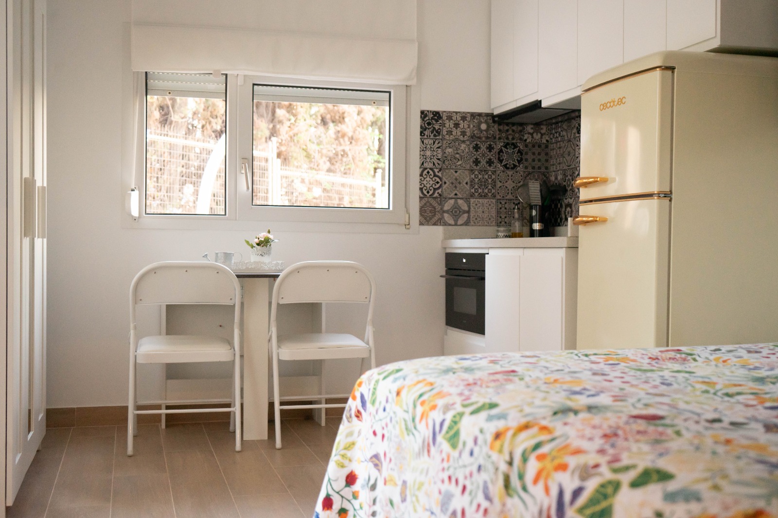 Frigorífico con congelador, Placa vitrocerámica de inducción, Horno/microondas, Tostador, Exprimidor eléctrico, Batidora, Hervidor, Hoyas, Sartenes, Utensilios de cocina